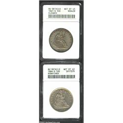 1861-S 50C--Cleaned--ANACS, AU Details, Net XF45, dull gray surfaces with golden accents around the rims; and an 1864-S--Scratched--ANACS, AU Details, Net XF40, well defined on the reverse with subdued patina, badly scratched at the top of the reverse.From the Ohio Collection. 2 coins Important notice: We expect to be auctioning lots at the rate of 200-250 per hour. Sometimes eBay Premier live bid software cannot keep up with that pace, so we strongly recommend that you place a realistic proxy bid now as insurance to avoid disappointment. Also please note that all Heritage/CAA lots purchased through eBay Premier carry a 20% Buyer's Premium. Please make sure you read the Terms and Conditions.
