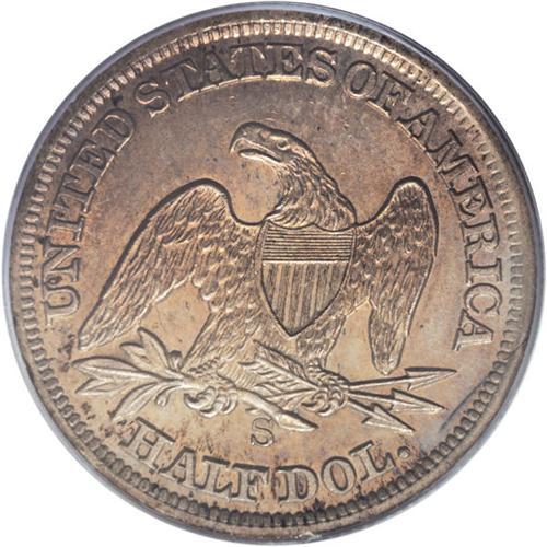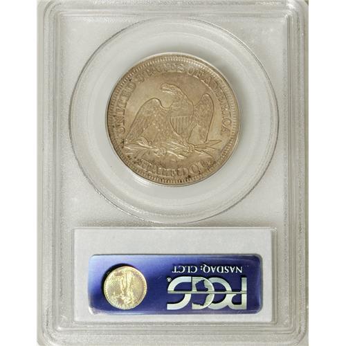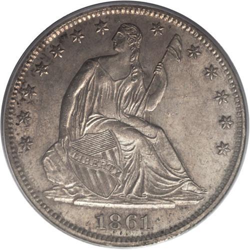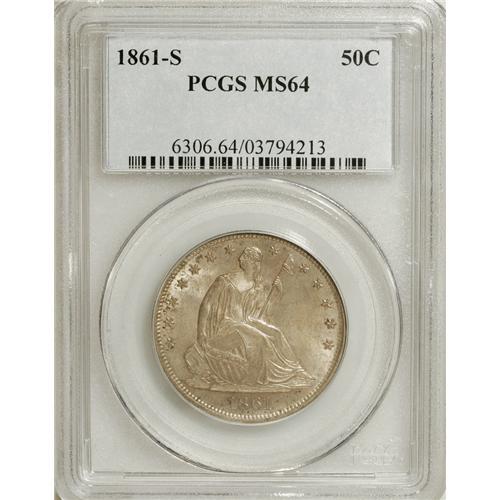 <B>1861-S 50C MS64 PCGS.</B></I> WB-101. Large Mintmark. Well struck with satin luster and pleasing champagne-gray toning over the obverse. Amber-gold coloration is seen on the reverse. A slight degree of speckled olive-gray patina hugs the peripheries. The few tiny surface marks on each side seem minimal for the grade.<BR><BR><b>Shipping:</b> Coins & Currency (<a target="_blank" href="http://www.heritageauctions.com/common/shipping.php">view shipping information</a>)