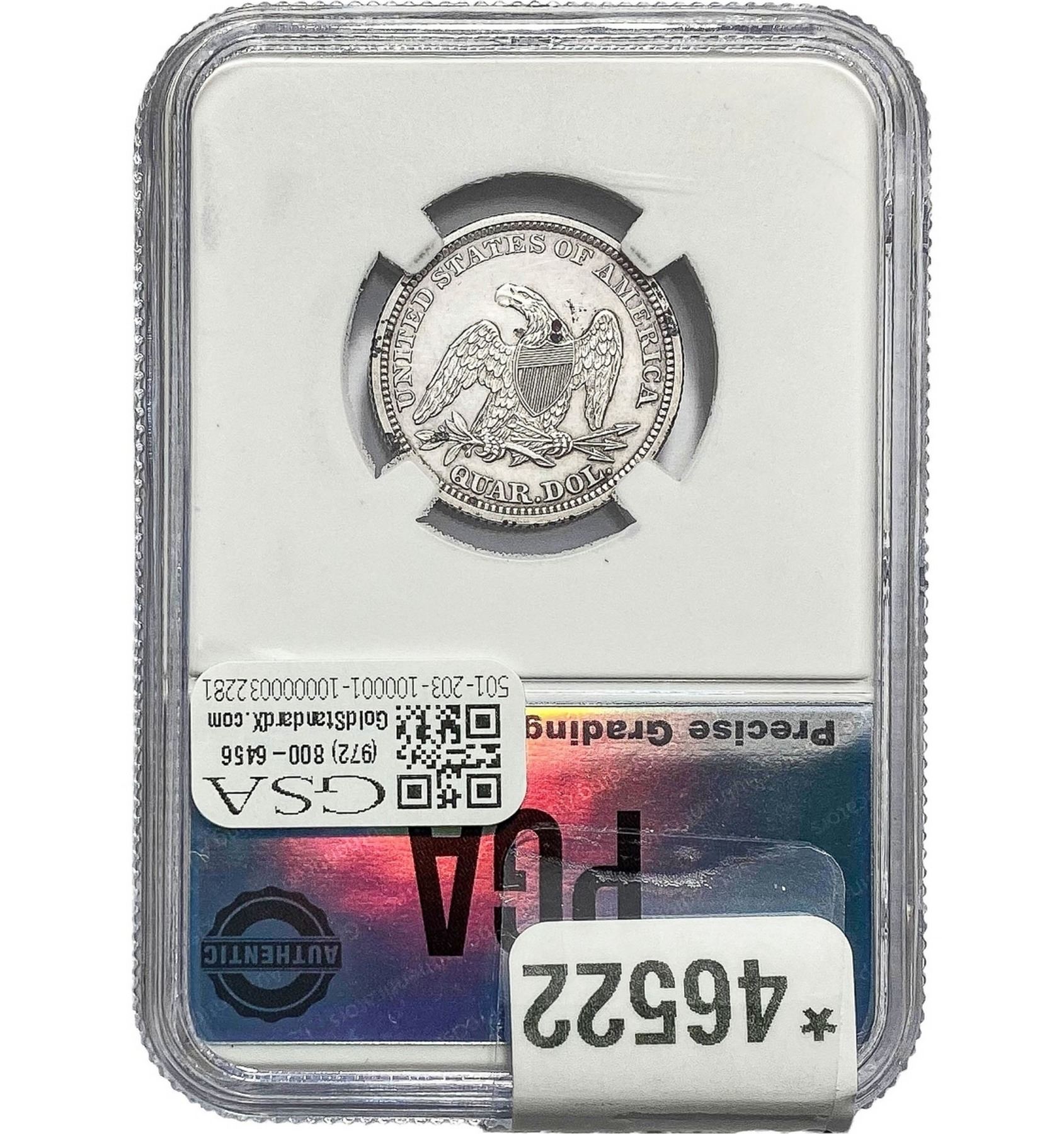COINS AND CURRENCY LISTED IN GSA’S CATALOG AS GRADED AND ENCAPSULATED BY PCGS, NGC, ANACS, ICG, PCGS CURRENCY, PMG, PCGS BANKNOTE GRADING, CMC OR ANY OTHER THIRD-PARTY GRADING SERVICE ARE LIKEWISE SOLD “AS-IS” EXCEPT AS EXPRESSLY SET FORTH HEREIN. ALL THIRD-PARTY GRADING SERVICE GUARANTEES, INCLUDING AUTHENTICITY, ARE THE SOLE RESPONSIBILITY OF THE THIRD-PARTY GRADING SERVICE AND NOT WARRANTIES OR GUARANTEES OF GSA. BIDDERS SHOULD CONTACT THESE THIRD-PARTY GRADING SERVICES DIRECTLY WITH RESPECT TO ANY CLAIMS OR QUESTIONS THEY MAY HAVE CONCERNING THEIR GUARANTEES AND WARRANTIES. BIDDERS ACKNOWLEDGE AND AGREE THAT AUCTIONEER IS NOT BOUND BY OR LIABLE FOR ANY OPINION OR CERTIFICATION BY ANY THIRD-PARTY GRADING SERVICE. REMOVAL OF A PRODUCT FROM ITS PROTECTIVE CASING OR HOLDER OR ALTERATION OF ANY COIN HOLDER WAIVES ALL RIGHTS CONCERNING THE PRODUCT CONTAINED THEREIN.