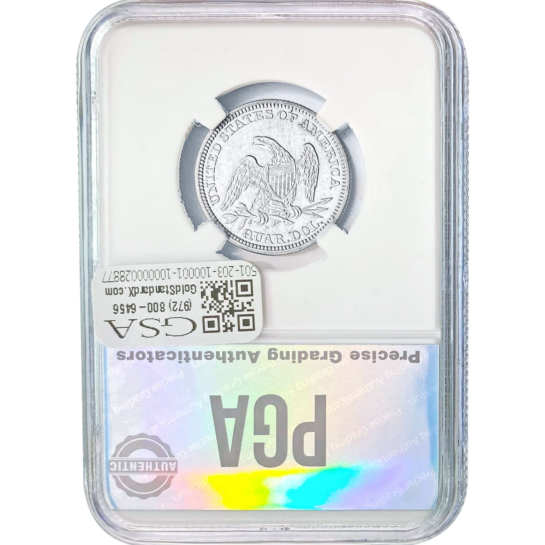 COINS AND CURRENCY LISTED IN GSA’S CATALOG AS GRADED AND ENCAPSULATED BY PCGS, NGC, ANACS, ICG, PCGS CURRENCY, PMG, PCGS BANKNOTE GRADING, CMC OR ANY OTHER THIRD-PARTY GRADING SERVICE ARE LIKEWISE SOLD “AS-IS” EXCEPT AS EXPRESSLY SET FORTH HEREIN. ALL THIRD-PARTY GRADING SERVICE GUARANTEES, INCLUDING AUTHENTICITY, ARE THE SOLE RESPONSIBILITY OF THE THIRD-PARTY GRADING SERVICE AND NOT WARRANTIES OR GUARANTEES OF GSA. BIDDERS SHOULD CONTACT THESE THIRD-PARTY GRADING SERVICES DIRECTLY WITH RESPECT TO ANY CLAIMS OR QUESTIONS THEY MAY HAVE CONCERNING THEIR GUARANTEES AND WARRANTIES. BIDDERS ACKNOWLEDGE AND AGREE THAT AUCTIONEER IS NOT BOUND BY OR LIABLE FOR ANY OPINION OR CERTIFICATION BY ANY THIRD-PARTY GRADING SERVICE. REMOVAL OF A PRODUCT FROM ITS PROTECTIVE CASING OR HOLDER OR ALTERATION OF ANY COIN HOLDER WAIVES ALL RIGHTS CONCERNING THE PRODUCT CONTAINED THEREIN.