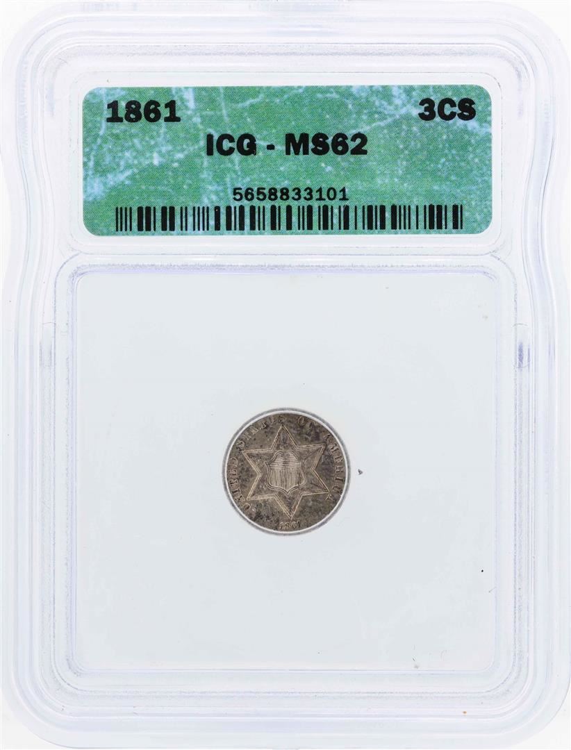 One 1861 Three Cent Silver Piece Coin ICG MS62. ICG Certified.