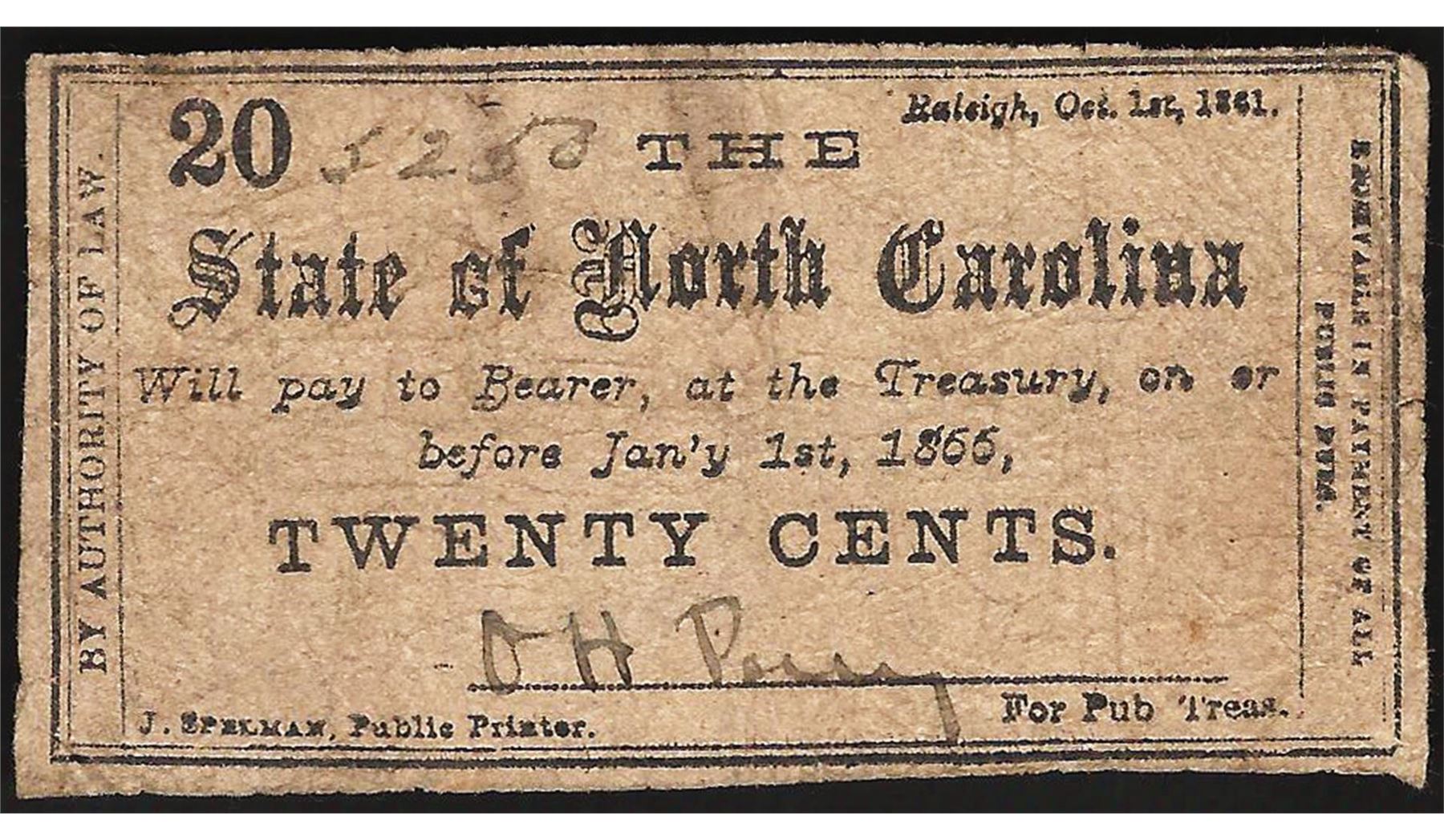 One 1861 Twenty Cents State of North Carolina Obsolete Note.