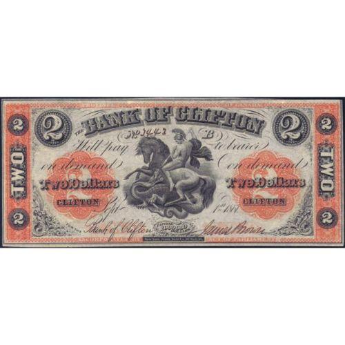 1861 Two Dollars Bank of Clifton, Engraved 1, CH 125-12-12 Serial Number 3443 B, PMG Choice Uncirculated 64 Exceptional Paper Quality