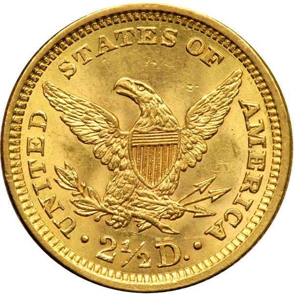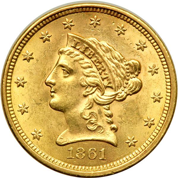1861 Type 2 $2½ Liberty. NGC graded MS-63. A nice frosty coin. With the secession of several States from the Union in 1860-61, demand by gold depositors to turn their bullion into coins increased dramatically in 1861 and 1862. This quarter eagle is a nice Civil War period date in choice Mint condition. Pop 45; 55 finer.