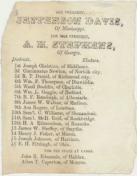 A good early war-date printed Confederate first and only presidential ballot issued by the state of Virginia, 12mo., reading: "For President, JEFFERSON DAVIS of Mississippi, for Vice President A. H. STEPHENS of Georgia". Spindle hole in center, signed on the verso by a certain "J. W. Gilkeson". Fine.