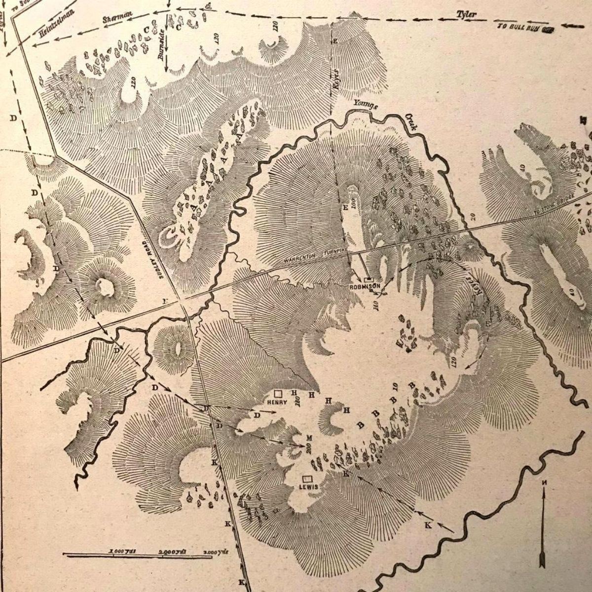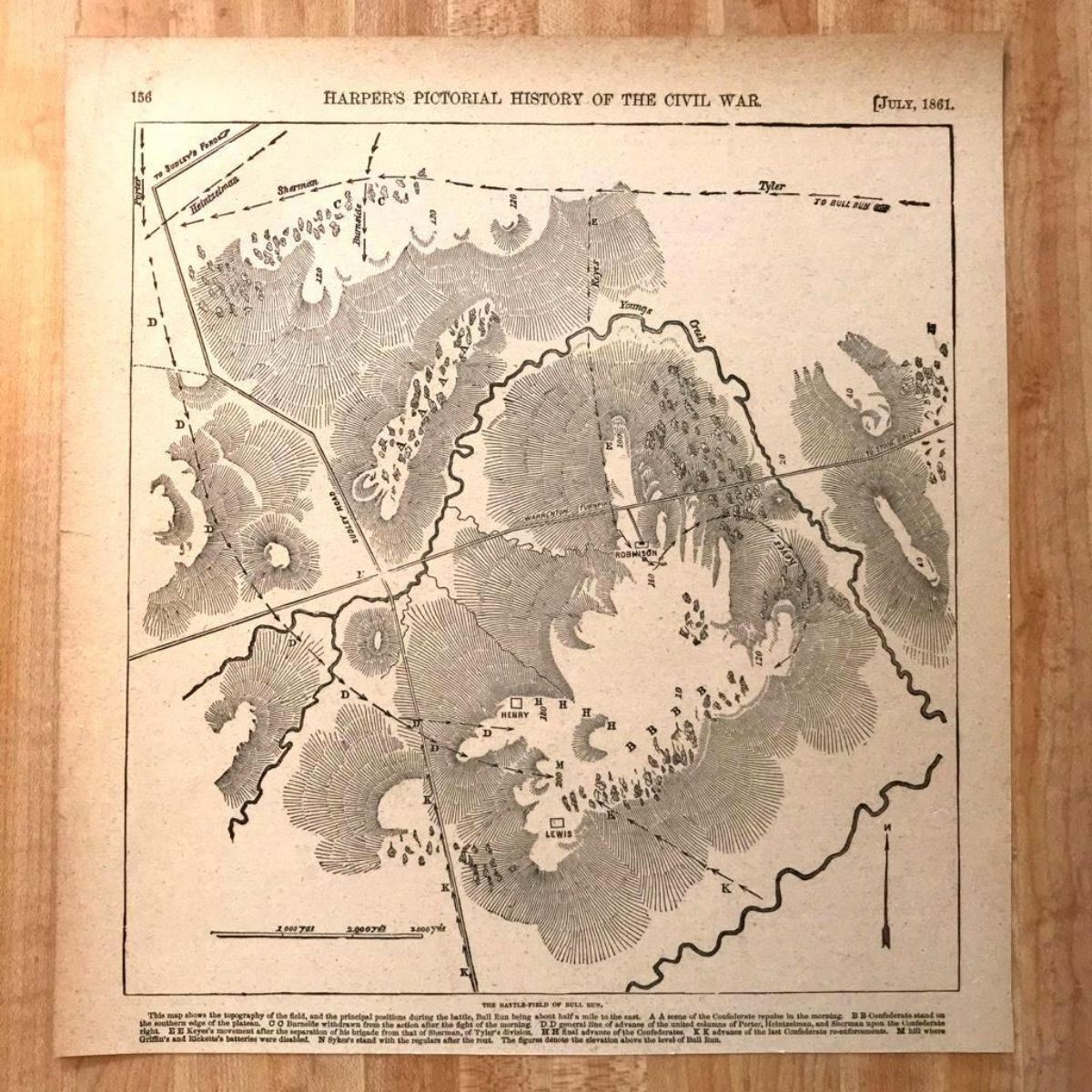 Civil War Battlefield Map of Bull Run, Virginia, from a July 1861 edition of Harper's Pictorial History Of The Civil War. 10" X 11" suitable for framing.Â