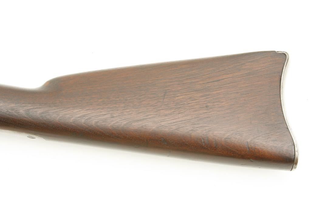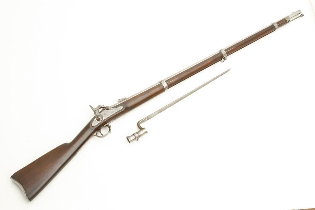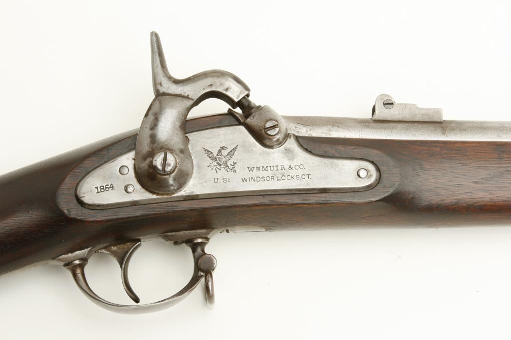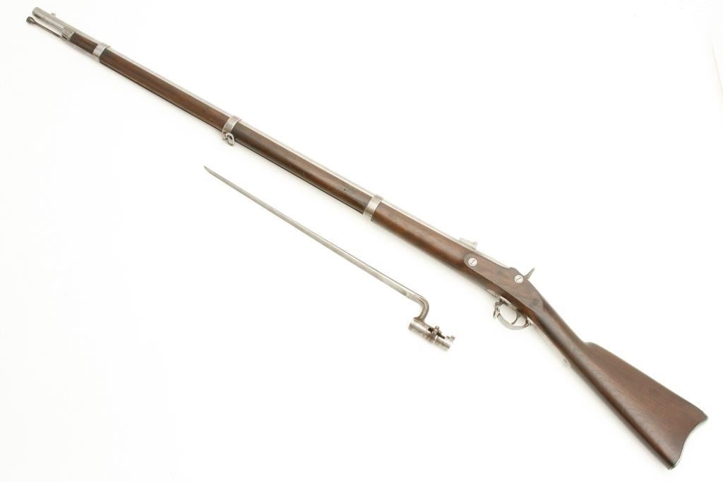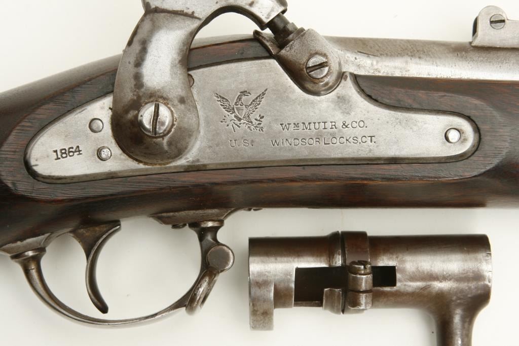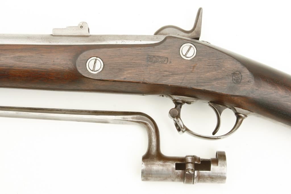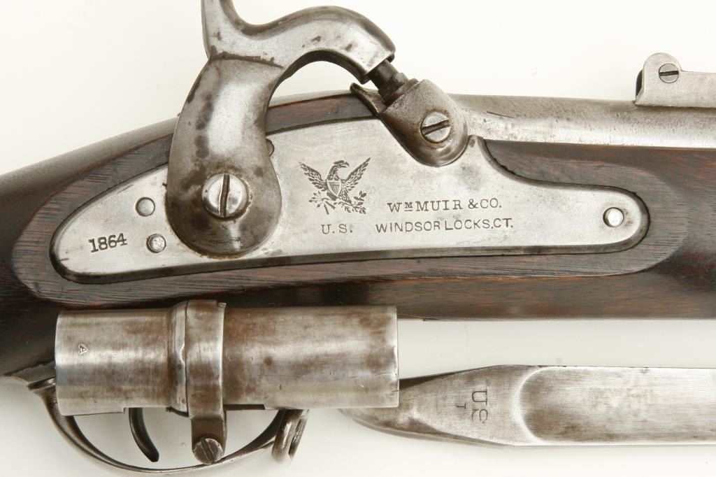 Windsor locks, CT 1864” in .58 caliber percussion with 3 bands and as issued showing most original bright with minor pitting and staining in a few areas. Good sharp markings and edges. Near fine stock with two sharp and fully defined cartouches. No losses or stock wear along ramrod channel. A sharp and crisp 1861 in very good plus to near fine condition with rod and proper bayonet. (Antique) Est.: $800-$1600