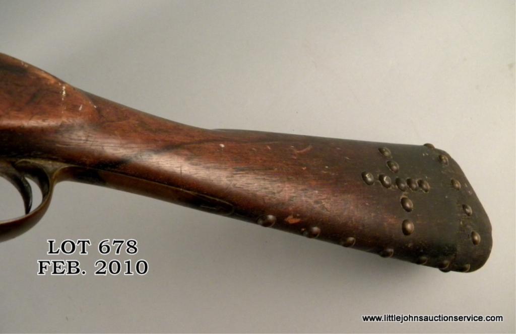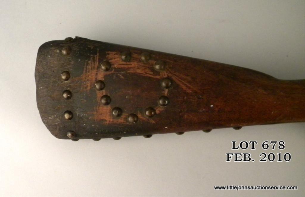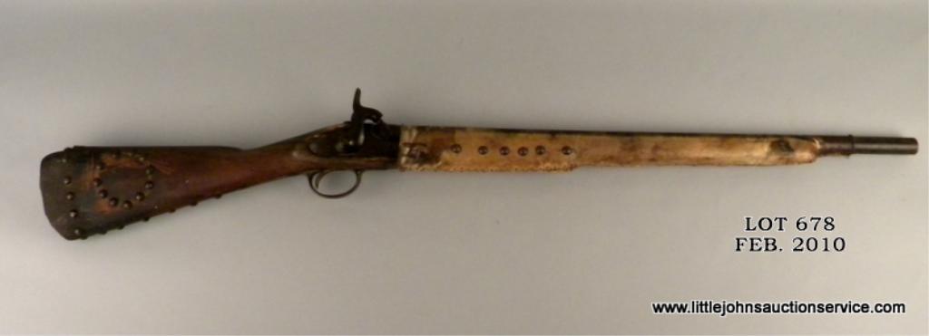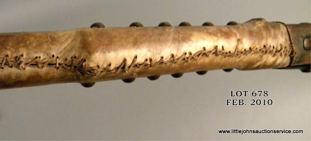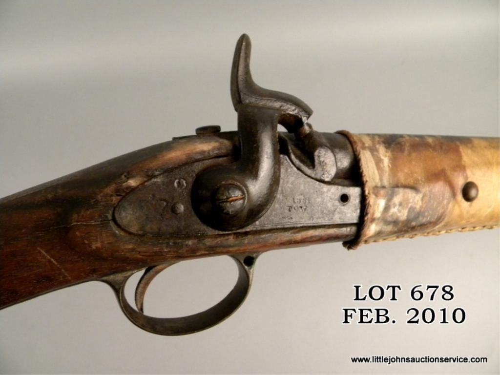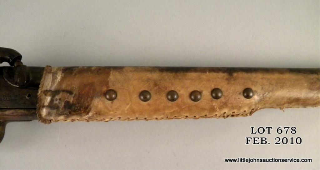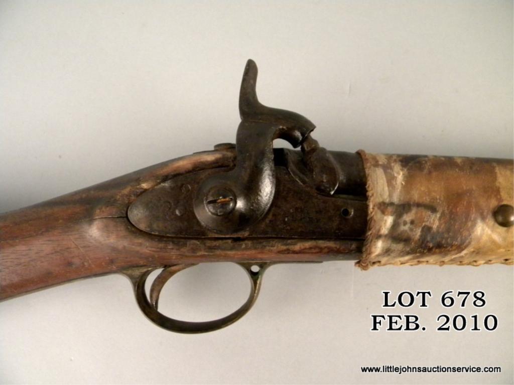 1861 dated tower .58 caliber brass mounted musket, cut and wrapped with tacks and Indian style decorations. The gun measures 41-3/4" overall with 26" barrel. The metal surfaces show light to heavy pitting within a black to brown deep patina. The forestock is hide wrapped and sinew stitched with many large brass tacks which show patina. The buttplate is removed and butt scorched from camp fires. The end of the stitching near the muzzle shows a loop where a feather was once attached. A real Indian gun that shows frontier wear and carry and is from a local collectors estate who obtained it from James Serven in the 1950's by tradition. Est: $1,000 - $3,000