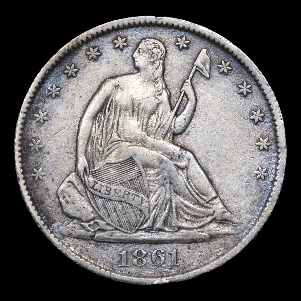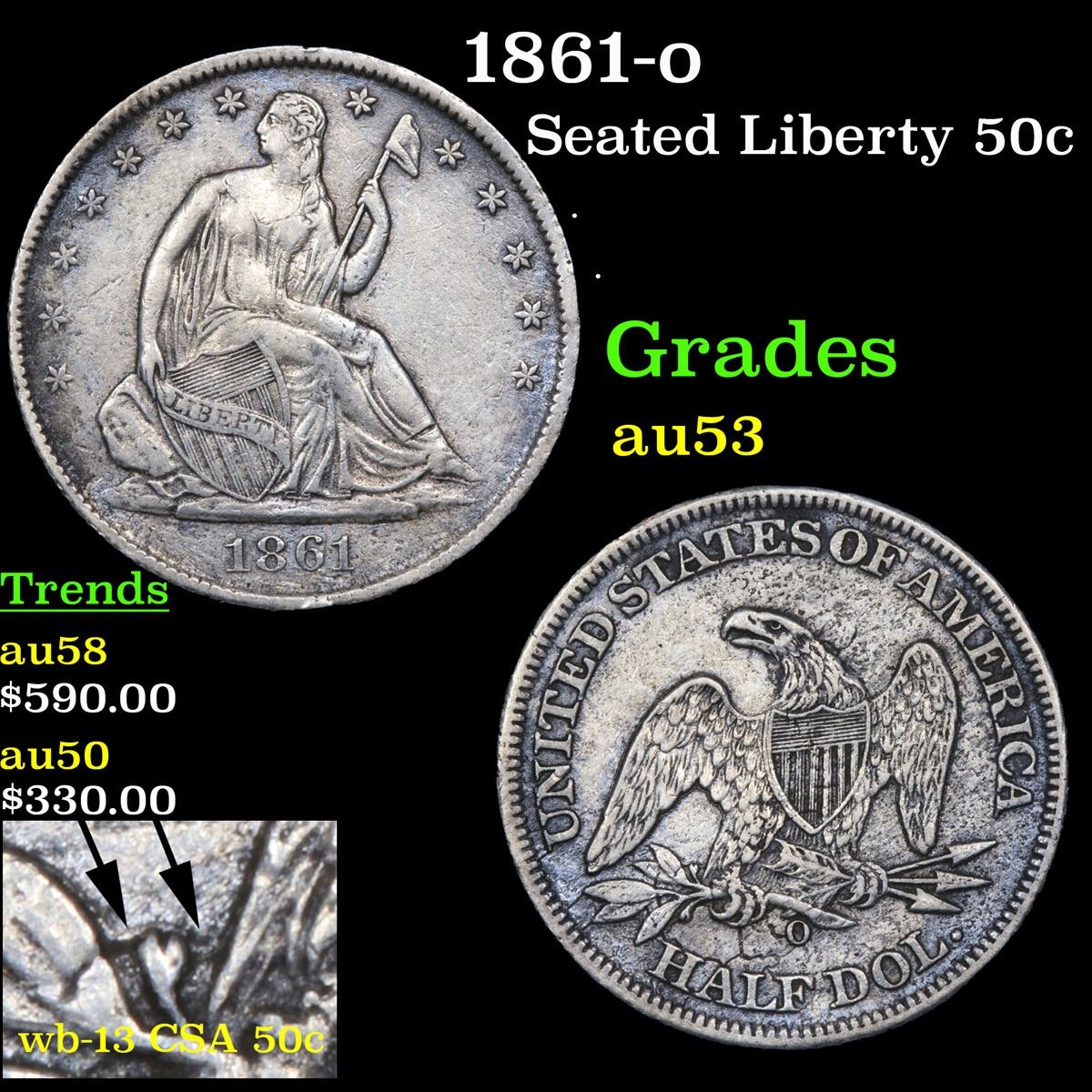 1861-o . . Seated Half Dollar 50c Grades Select AU. 1861 was a turbiluent year at the New orleans mint. At the end of january of that year the mint was seized by the state of Lousina who ran it for 2 months then gave it to the confedericy who then ran it for another 6 weeks, Until the mint ran out of bullion on may 14 1861. Extensive reserach has been done to identify the 15 die parings used during this period. The Coin Up For Auction is die marrige WB-104, WHich was struck in late april By the confedericy. A highly Desirable Issue A Corey's Pick, Bid to Win, Don't let it get Away, you might not find its equal Coin. I give this coin my highest recommendation