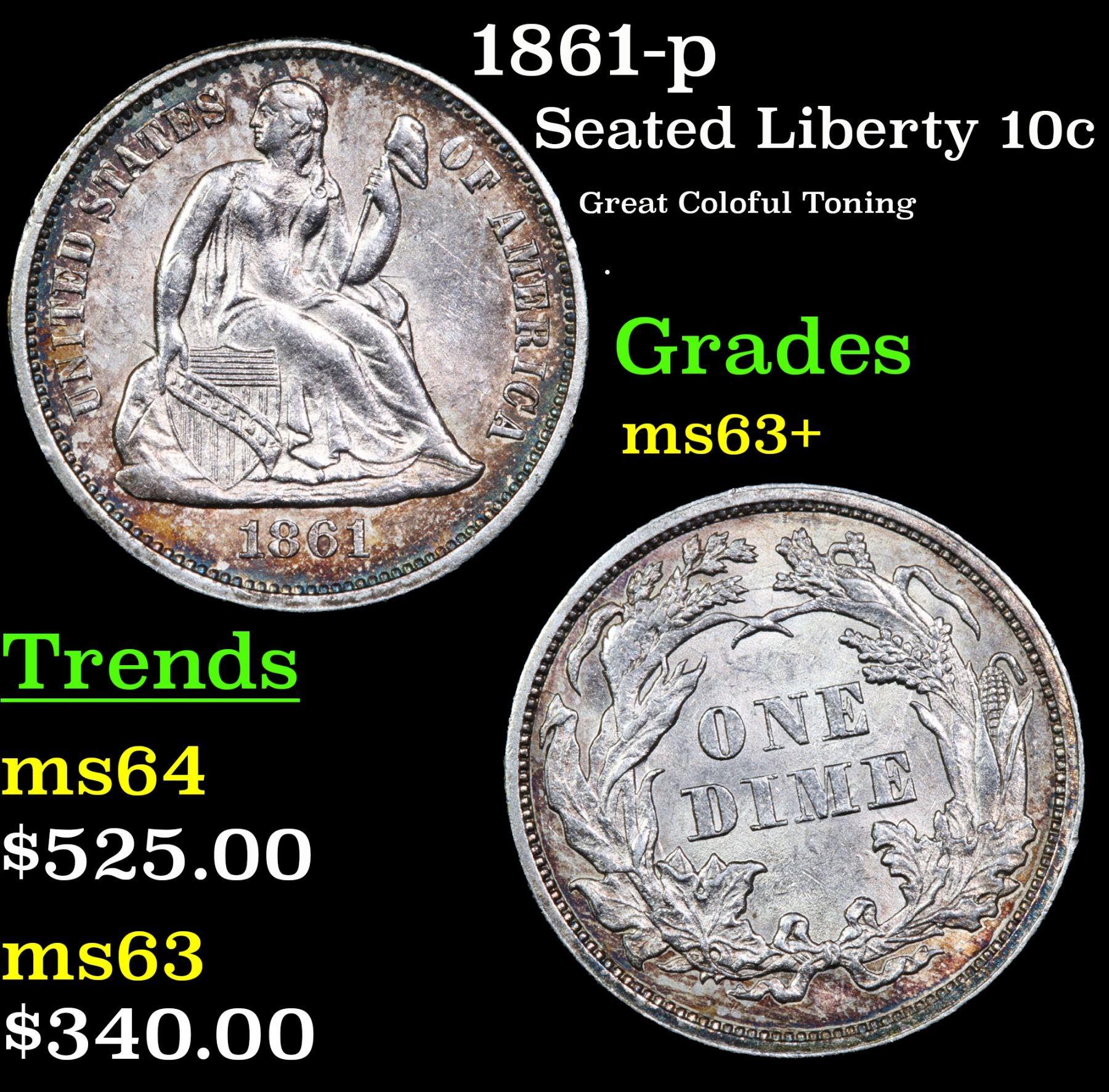 1861-p Great Coloful Toning . Seated Liberty Dime 10c Grades Select+ Unc.