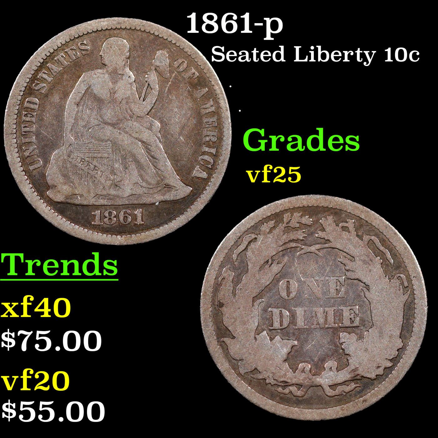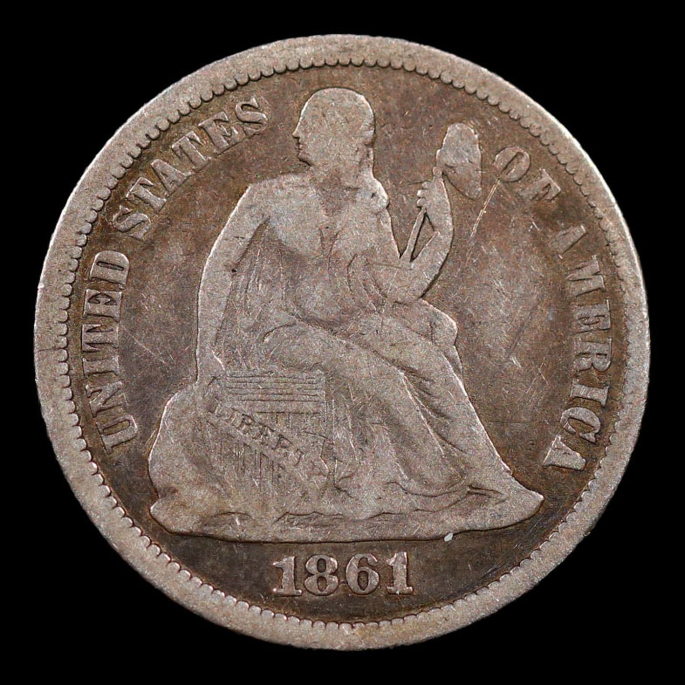 1861-p Seated Liberty Dime 10c Grades vf+.