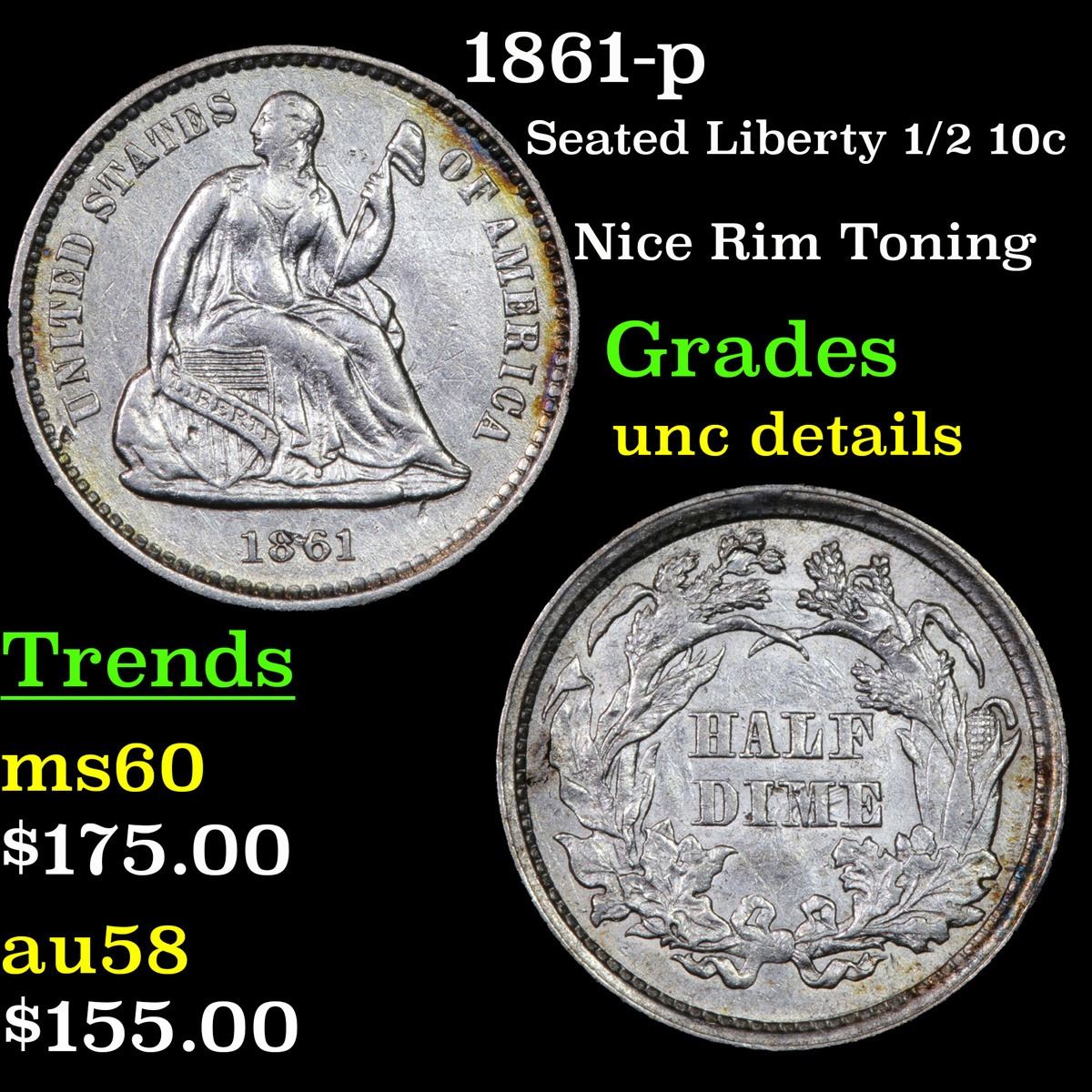 1861-p Nice Rim Toning . Seated Liberty Half Dime 1/2 10c Grades Unc Details.