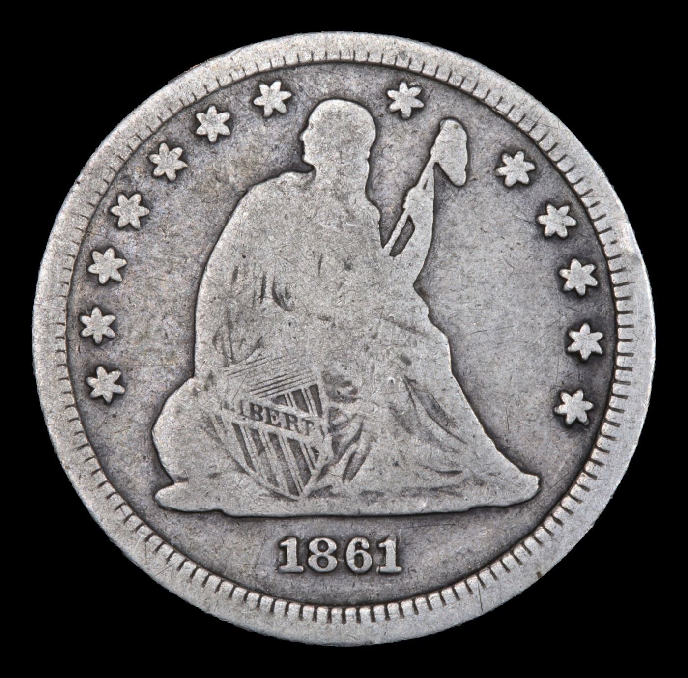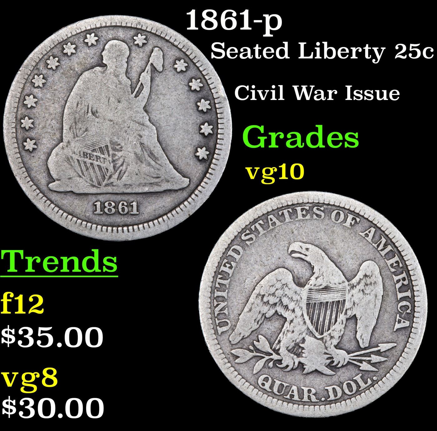 1861-p Seated Liberty Quarter 25c Grades vg+.