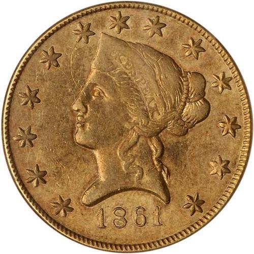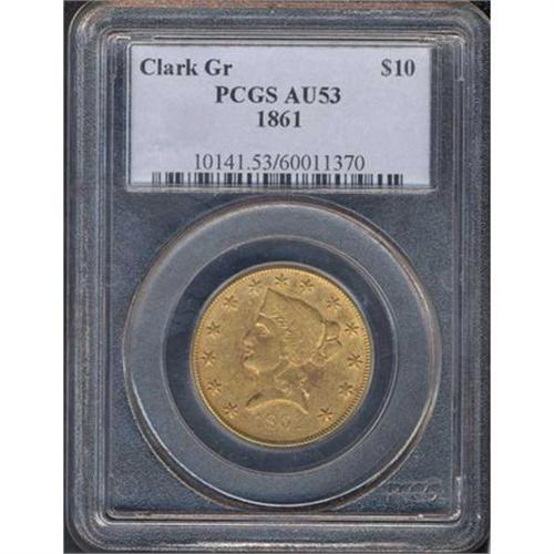 <b>1861 Clark, Gruber & Co (Denver, Colorado) $10 Gold. PCGS graded AU53.</b> An old hairline scratch from the nose curving up to star 6 near the coronet point, which is very weak and indistinct. It is easy to see this piece was delivered an insufficient blow by the dies, or as some researchers believe, the dies were used set too far apart, which caused the struck planchet to be struck unevenly at this point in the design. Just the same, the surface retains original luster around the devices and legends, with clean surfaces (outside the hairline mentioned above) attesting to its proper handling during the time it was used as well as in the century or more in the hands of collectors. Scarce Clark, Gruber territorial issue <b>(PCGS # 10141)</b>