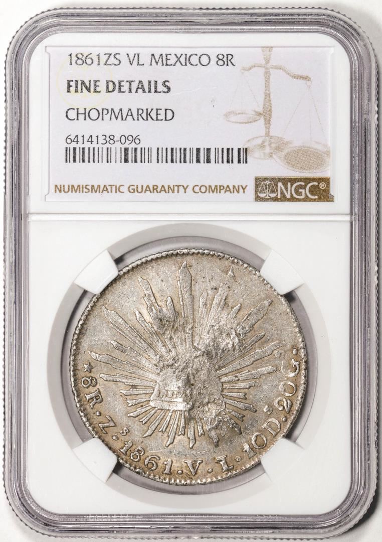 One 1861ZS VL Mexico 8 Reales Silver Coin NGC Fine Details Chopmarked. NGC Certified.
