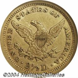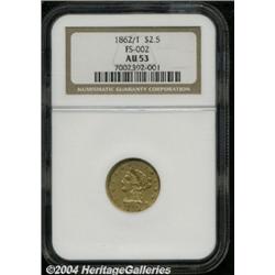 <B>1862/1<$2 1/2> AU53 NGC.</B></I> FS-002. Breen-6261. According to Breen, the 1862/1 was discovered by noted Omaha dealer Aubrey Bebee in 1962, and was first reported in the January 1963 issue of <I>Numismatic Scrapbook.</B></I> A rare variety, most survivors are in AU condition, such as the present example. A nicely struck but slightly subdued deep golden piece that has a couple of minor pinscratches on the obverse field. <BR><BR><B>Important notice:</B> Heritage usually auctions material at the rate of 200-250 lots per hour. On some occasions eBay Live bid software or the Internet may not be able to keep up with the pace of the auction. We recommend placing a realistic absentee bid now as insurance to avoid disappointment. Occasionally the auctioneer may eliminate or reject an eBay Live bid, and the auctioneer may also reopen a lot after the close of the eBay live bidding (usually because we missed an audience bid), and may reject your bid even if it shows you as the winning bidder. By bidding via eBay Live, you agree that Heritage may award the lot to another bidder at its sole discretion under the circumstances described above or any other reasonable circumstances. Since eBay bids are not shown to us until we open the lot on the floor, we treat those bids just like floor bids. In most cases the floor responds before the eBay bid is presented to us, due to Internet lag time, so for consistency we have made it a policy that floor bids are always considered first over tie eBay live bids. Also please note that all Heritage lots purchased through eBay Live carry a 20% Buyer's Premium. Please make sure you read the Terms and Conditions before you bid. </span></font></tr></table></td></tr></table>