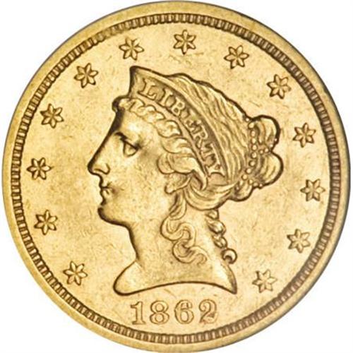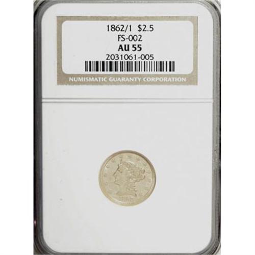 <B>1862/1 $2 1/2 AU55 NGC.</B></I> FS-002. Substantial bright luster is evident, particularly on the reverse. The eagle's neck and wings show slight indifference of strike; however, the remainder of the devices are well impressed by the dies. Tiny marks are distributed but are not significant. A rare overdate, similar in appearance to its 1862/1 three cent silver counterpart. The only overdate variety of any gold denomination from the Civil War.<BR><BR><B>Coin Engraver:</B> Christian Gobrecht<BR><BR><b>Shipping:</b> Coins & Currency (<a target="_blank" href="http://www.heritageauctions.com/common/shipping.php">view shipping information</a>)