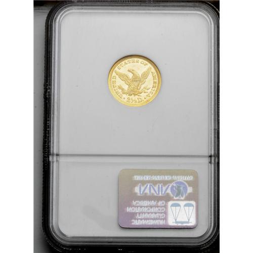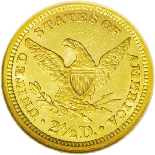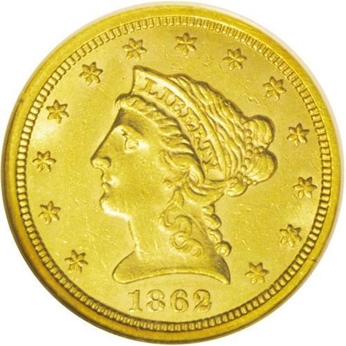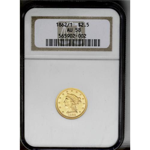 <B>1862/1<$2 1/2> AU58 NGC.</B></I> It is highly unusual that we have the opportunity to offer two similarly graded examples of this elusive overdate in the same sale. Possibly, as a result of the Civil War, the decision was made by the coining staff at the Philadelphia Mint to recycle an 1861 quarter eagle die, and punch a 2 over the existing 1 with partial effacement of the underdigit. This variety was discovered over 40 years ago by Aubrey Bebee. Numerous small abrasions have collected in the fields and one mentionable mark is noted on Liberty's neck behind her hair curl. The surfaces are a bright yellow-golden color with pink highlights in selected protected areas.