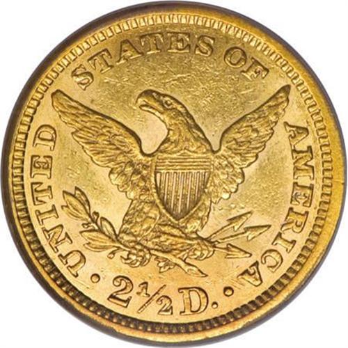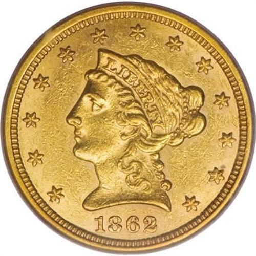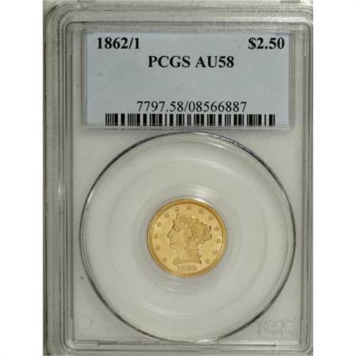 <B>1862/1 $2 1/2 AU58 PCGS.</B></I> FS-002. The upright of the 1 is obvious beneath the ball of the 2. A scarce variety found on a minority of the 1862 emission. This boldly struck piece has impressive peripheral luster and an absence of individually mentionable marks. Population: 4 in 58, 3 finer (6/07).<BR><BR><B>Coin Engraver:</B> Christian Gobrecht<BR><BR><b>Shipping:</b> Coins & Currency (<a target="_blank" href="http://www.heritageauctions.com/common/shipping.php">view shipping information</a>\)