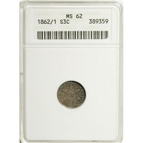 <B>1862/1 3CS MS62 ANACS.</B></I> NGC Census: (20/225). PCGS Population (22/273). Mintage: 343,000. Numismedia Wsl. Price for NGC/PCGS coin in MS62: $275. (#3681)<BR><BR><B>Coin Engraver:</B> James B. Longacre<BR><BR><b>Shipping:</b> Coins & Currency (<a target="_blank" href="http://www.heritageauctions.com/common/shipping.php">view shipping information</a>)