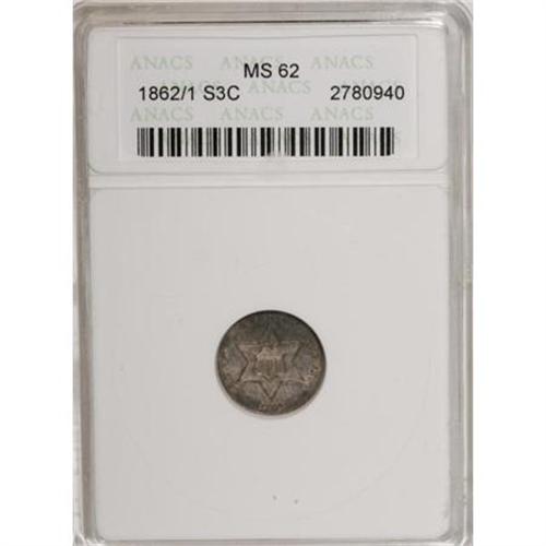 <B>1862/1 3CS MS62 ANACS.</B></I> NGC Census: (20/225). PCGS Population (22/287). Mintage: 343,000. Numismedia Wsl. Price for NGC/PCGS coin in MS62: $285. (#3681)<BR><BR><B>Coin Engraver:</B> James B. Longacre<BR><BR><b>Shipping:</b> Coins & Currency (<a target="_blank" href="http://www.heritageauctions.com/common/shipping.php">view shipping information</a>)