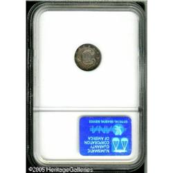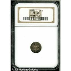<B>1862/1 3CS MS64 NGC.</B></I> The underdigit is quite pronounced on this piece with light magnification (come to think of it, just about everything on a three cent silver requires magnification). The striking details are sharp throughout and each side shows pronounced die clashing. The centers are more brilliant than not with deep russet and sea-green toning around the margins. Lot:5659