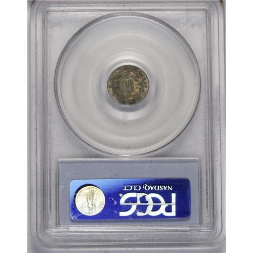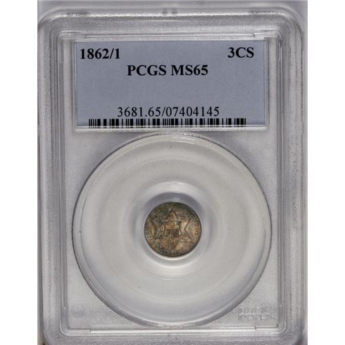 <B>1862/1<3CS> MS65 PCGS.</B></I> The telltale spike from the base of the 2 identifies the variety. This trime has fascinating toning, with red, violet, and blue over somewhat reflective surfaces.