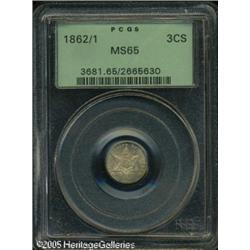 <B>1862/1 3CS MS65 PCGS.</B></I> Very sharply struck for a Type Three, this piece also shows the most pronounced evidence of die clashing we can remember having seen--and that is saying a lot for a three cent silver as they are usually die clashed. Highly lustrous, there is just the lightest trace of golden toning over each side. Lot:5660