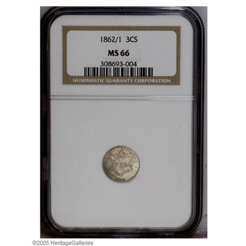 <B>1862/1<3CS> MS66 NGC.</B></I> The underdigit 1 is not obvious. Stingy splashes of cobalt-blue and lavender patina visit lustrous surfaces, especially on the obverse. The design elements are generally well struck, and the surfaces are clear of mentionable marks. Population: 63 in 66, 11 finer (9/05).