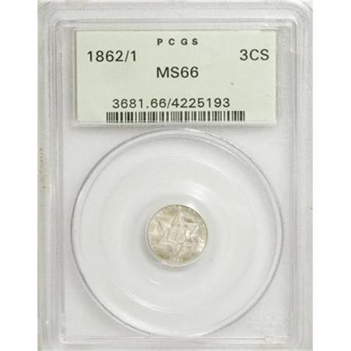 <B>1862/1 3CS MS66 PCGS.</B></I> FS-301, formerly FS-007. Glowing luster exudes from the lightly toned surfaces of this lovely Premium Gem, and a fairly sharp strike leaves nice definition on most of the design elements. Both sides exhibit strong clash marks, including most of the obverse shield within the III. A few grade-consistent marks do not disturb. Housed in a green-label holder. Population: 58 in 66, 11 finer (12/07).<BR><BR><B>Coin Engraver:</B> James B. Longacre<BR><BR><b>Shipping:</b> Coins & Currency (<a target="_blank" href="http://www.heritageauctions.com/common/shipping.php">view shipping information</a>)