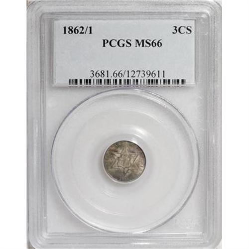 <B>1862/1 3CS MS66 PCGS.</B></I> FS-301, formerly FS-007. A lovely Premium Gem representative of this popular <I>Guide Book </B></I>variety, well-defined with strong, satiny luster beneath elegant peach and blue-green shadings. Carefully preserved and a visual delight. Population: 59 in 66, 11 finer (3/08).<BR><BR><B>Coin Engraver:</B> James B. Longacre<BR><BR><b>Shipping:</b> Coins & Currency (<a target="_blank" href="http://www.heritageauctions.com/common/shipping.php">view shipping information</a>)