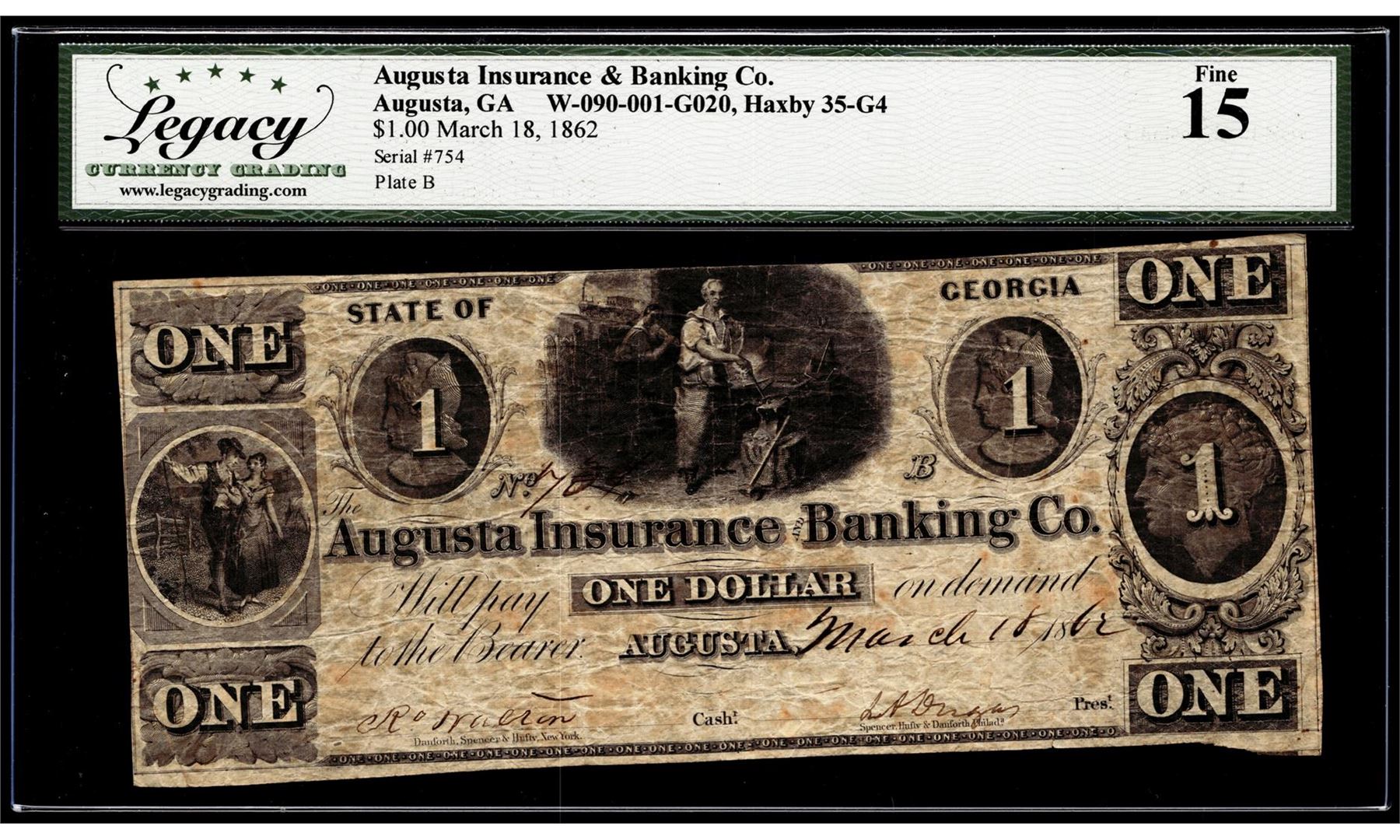 One 1862 $1 Augusta Insurance Banking Co. Augusta, GA Obsolete Note Legacy Fine 15. Legacy Graded.