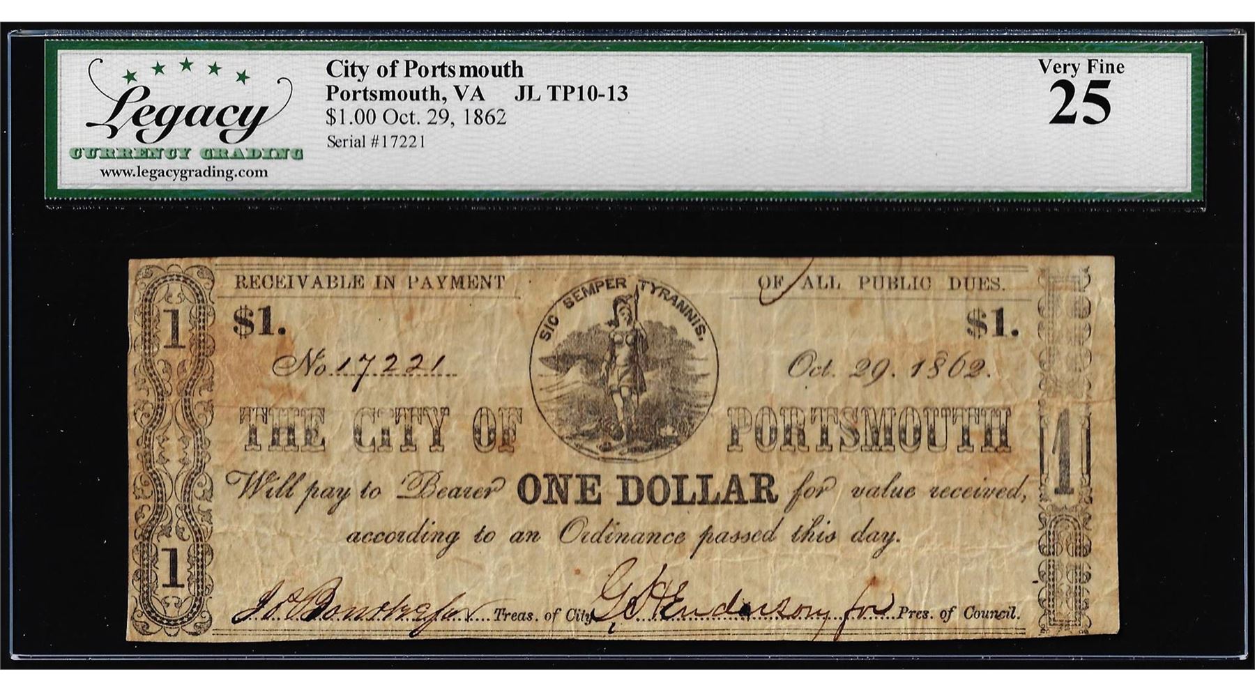 One 1862 $1 City of Portsmouth, Virginia Obsolete Note Legacy Very Fine 25. Legacy Graded.