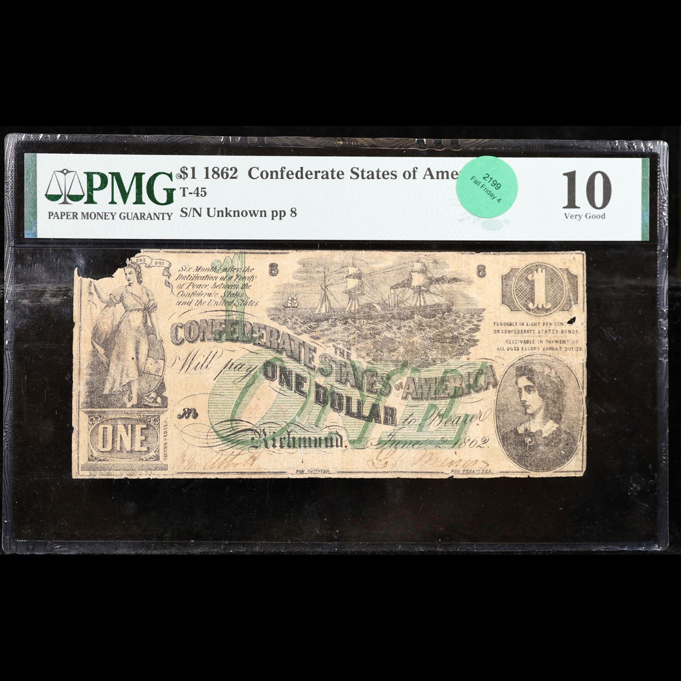1862 $1 Confederate Note Fr-T45 Graded vg10 By PMG. The First Lady of South Carolina, Lucy Pickens is depicted at lower right, with Liberty depicted at left. Some interesting choices were made by Blanton Duncan on this note design. The shield on the left apparently originated from art created for either Argentina or Uruguay, which both use the sun face in their national emblems. More importantly he unilaterally decided to upgrade the security on both the $1 and $2 notes from this series by adding a green protector. The Department of the Treasury took issue with this and refused to pay for the extra work. Duncan immediately removed the protectors but created two varieties in the process.