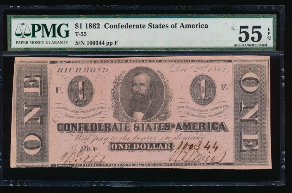 One 1862 $1 Confederate States of America Note PMG 55EPQ.