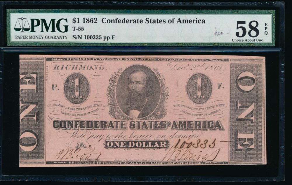 One 1862 $1 Confederate States of America Note PMG 58EPQ.