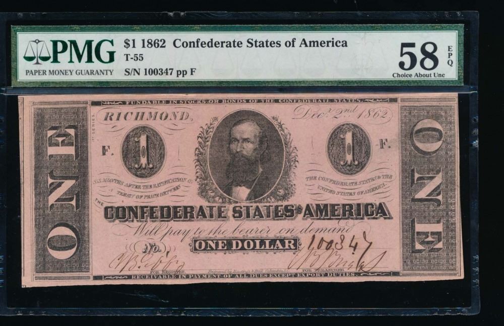 One 1862 $1 Confederate States of America Note PMG 58EPQ.