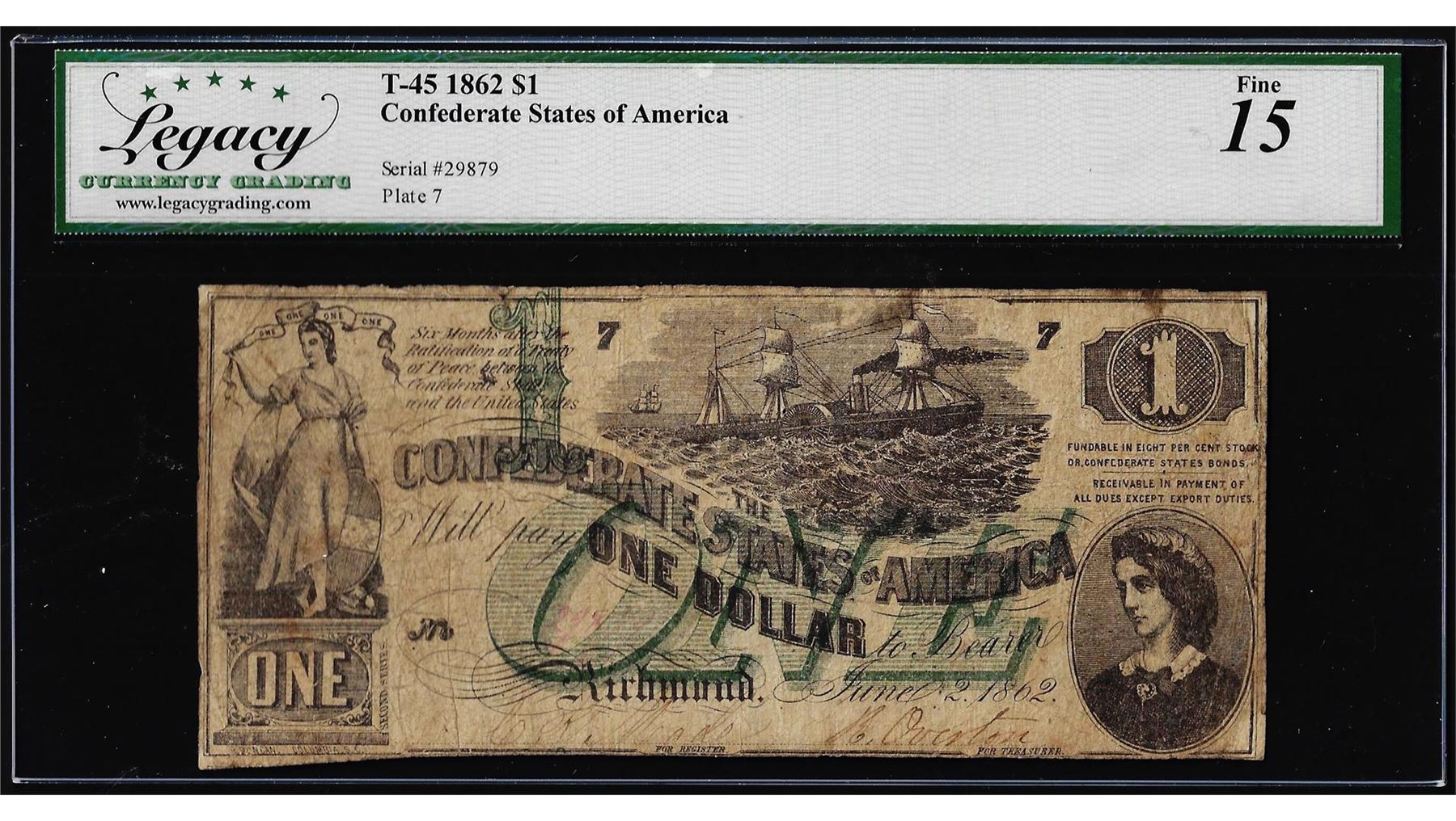 One 1862 $1 Confederate States of America Note T-45 Legacy Fine 15. Legacy Graded.