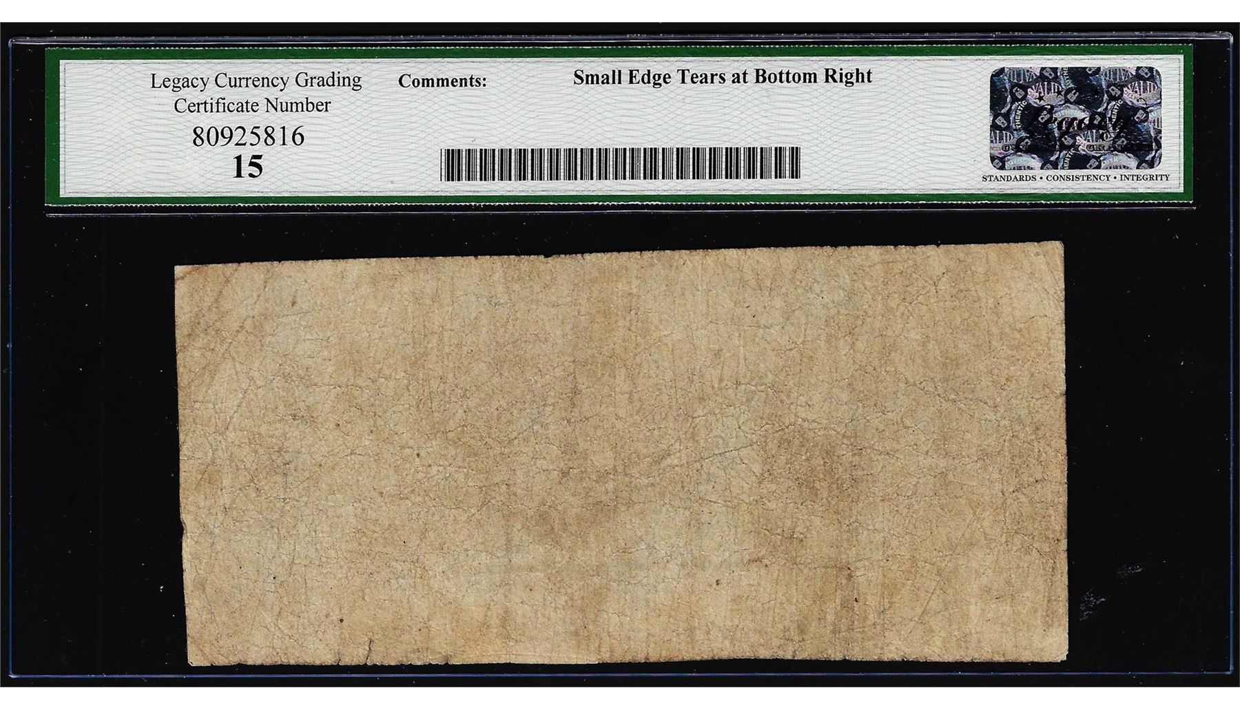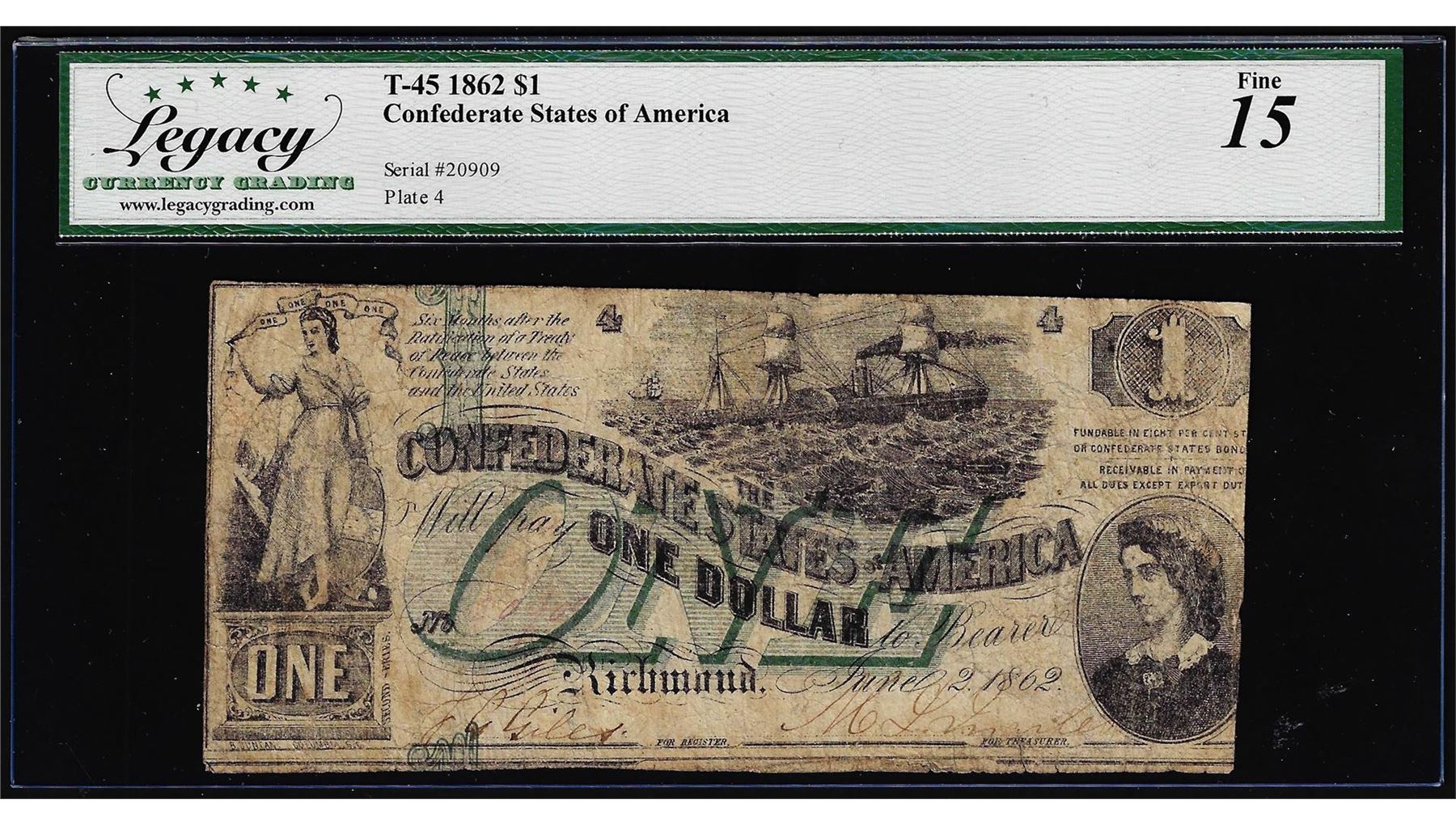 One 1862 $1 Confederate States of America Note T-45 Legacy Fine 15. Legacy Graded.