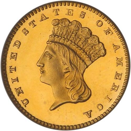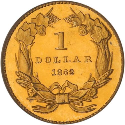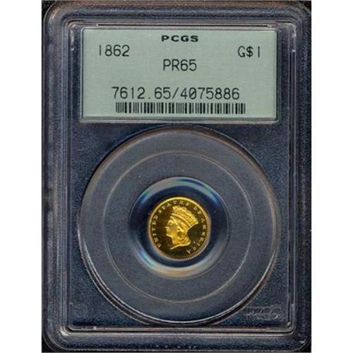 <b>1862 $1 Gold Indian. PCGS graded Proof 65.</b> A flashy Gem Brilliant Proof, virtually Superb with somewhat cameo devices that appear to float on the deeper reddish-gold mirror fields for out of this world beauty and appeal. One of only 35 Proofs struck, with nine recorded in the Dannreuther-Garrett auction survey covering a decade's worth of offerings. This remarkably well preserved Gem is as captivating as it is rare and sought-after by collectors of United States Proof gold coins.