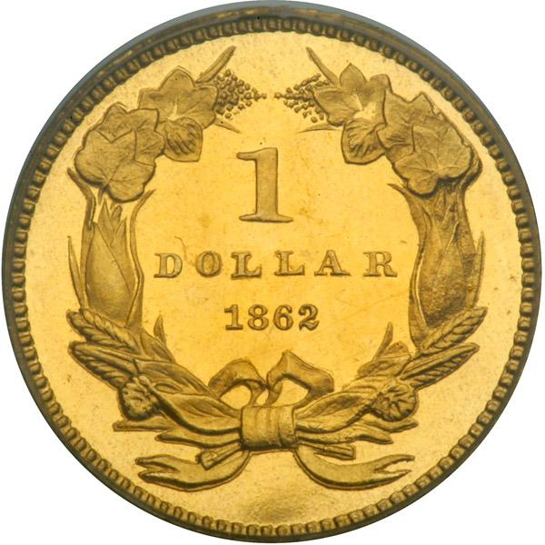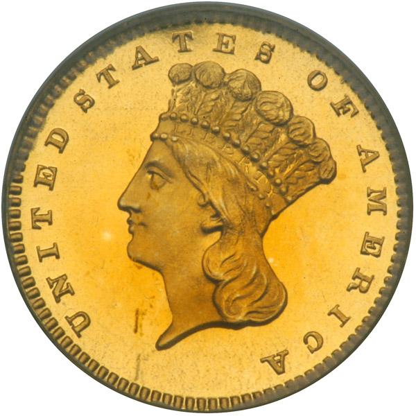 1862. PCGS graded Proof 64 Deep Cameo CAC Approved. A stunning deep cameo specimen with lovely delicate golden toning. Only 35 Proofs struck. The strike is bold on this deep cameo Indian gold dollar, with a full feather veins and puffs and a strong LIBERTY on the headband. (A touch of softness often shows at the tops of a couple of headdress feathers and the lowest hair curl, but this isn’t the case here.) Best of all, the color is a flaming, deep sunset-orange of the most delectable appearance. No carbon spots present, although a couple of tiny obverse streaks can be seen under a loupe near the rim below Liberty’s chin. Pop 2; 2 finer in 65 (PCGS # 97612) .