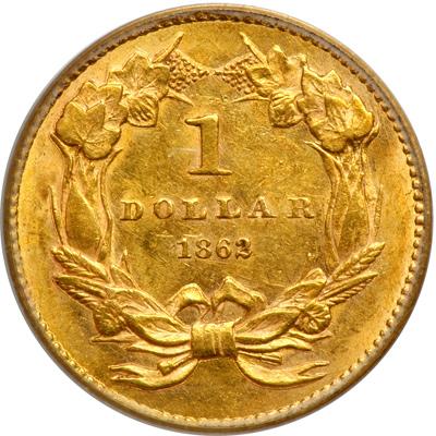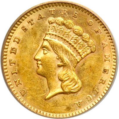 1862 $1 Gold Indian. PCGS graded AU-58. Lightly toned with natural luster covering the surface of both sides (PCGS # 7560).
