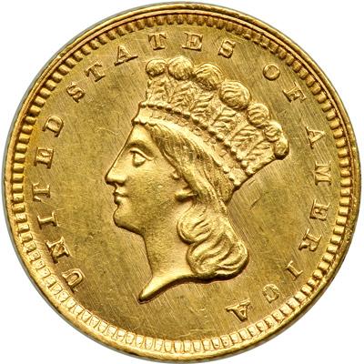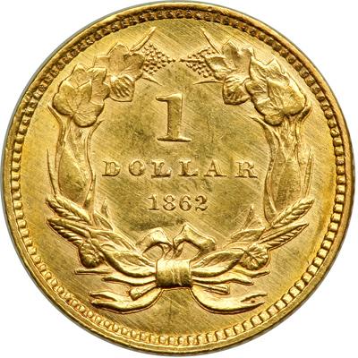 1862 $1 Gold Indian. PCGS graded MS-61. The field consists of die polish lines (as minted) with devices sharp and crisply defined including LIBERTY on the headband (PCGS # 7560) .
