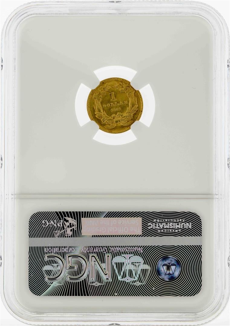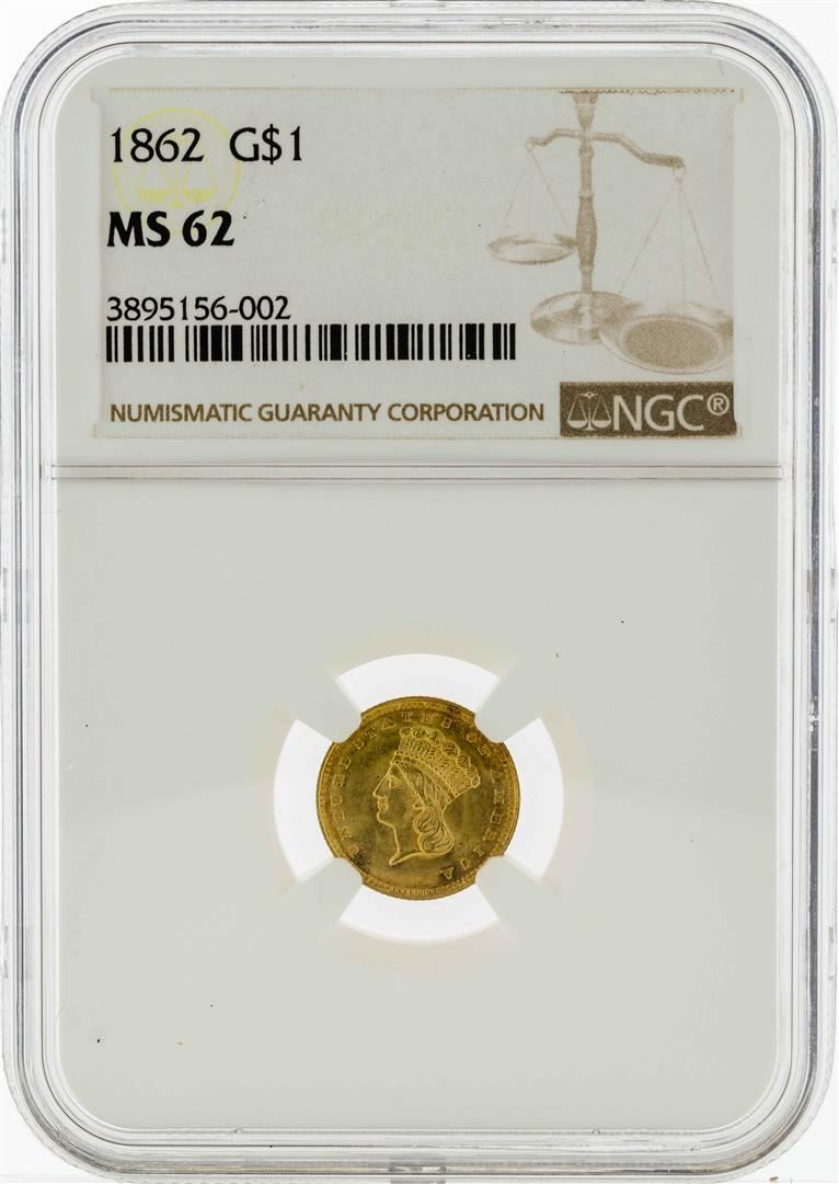 One 1862 $1 Indian Princess Head Gold Dollar Coin NGC MS62. NGC Certified.