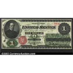 1862 $1 Legal Tender Note, Fr-16, CGA Choice Uncirculated 64. A near-Gem example of this first Legal Tender $1 issue. Nice centering and good colors give this note added eye appeal.