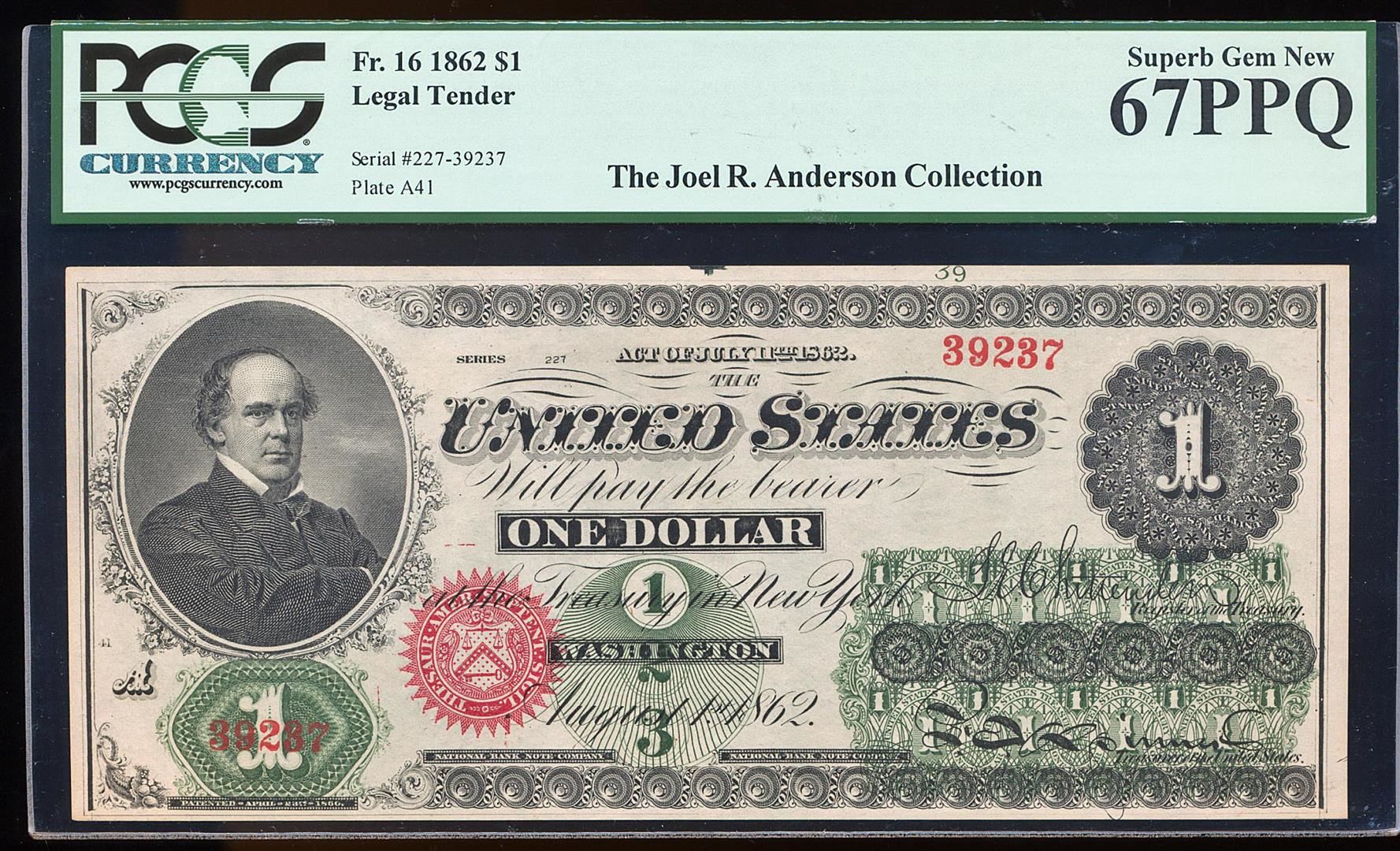 This superbly preserved 1862 $1 Legal Tender Note comes from the top position of the original 4-subject sheet, and still retains a little extra sheet selvage in the top margin. The paper is pristine, creamy white in color and fully original. The National Bank Note Company printed design is sharply detailed and darkly inked. Cherry red overprints are seen and contrast nicely with the rich green security tints. The ornate green printed back is also well detailed. This note is tied with one other at this grade level at PCGS with none finer. This is an incredibly important opportunity to acquire one of the finest examples of our first federal $1 type, an excellent Condition Census example of a popular note. Only a couple of people may own one of this caliber and it may be that no finer specimen exists! PCGS Graded.
