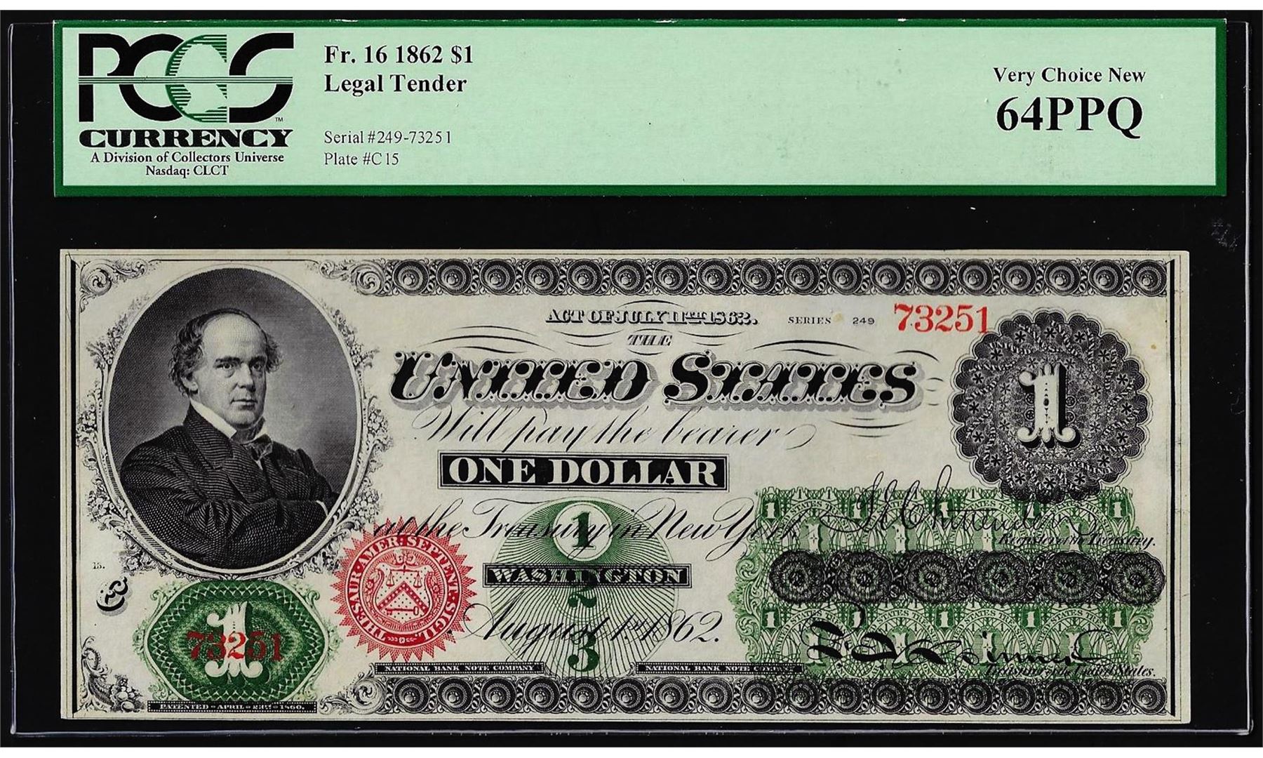 One 1862 $1 Legal Tender Note Fr.16 PCGS Very Choice New 64PPQ. PCGS Graded.