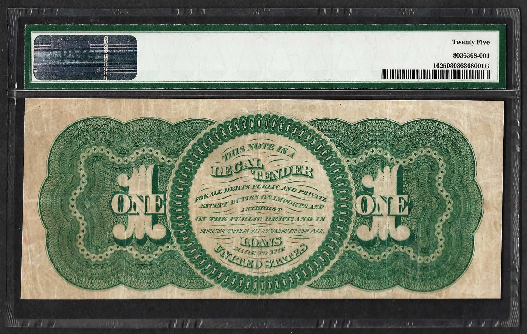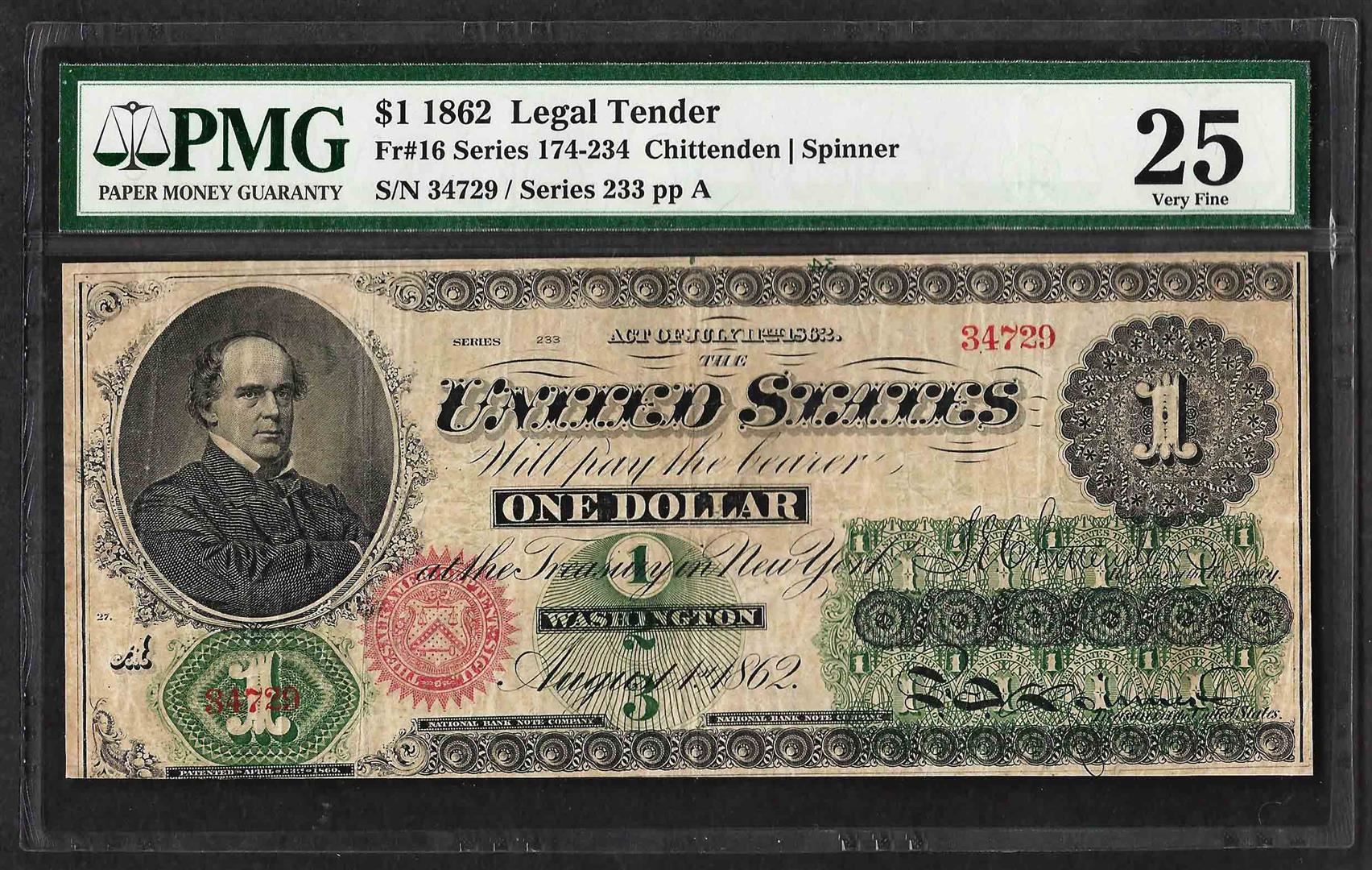 One 1862 $1 Legal Tender Note Fr.16 PMG Very Fine 25. PMG Certified.