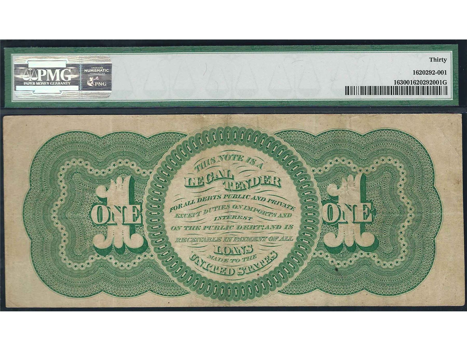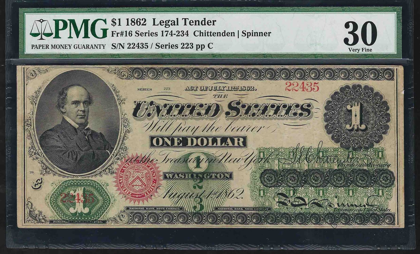 One 1862 $1 Legal Tender Note Fr. 16 PMG Very Fine 30. PMG Certified.