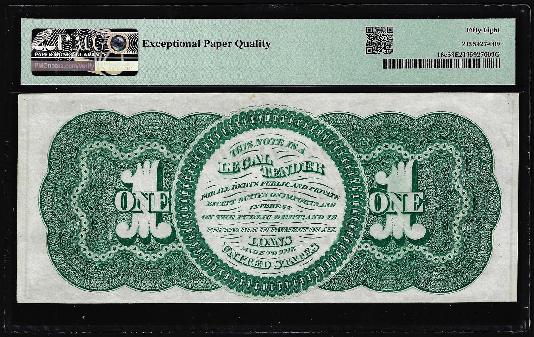One 1862 $1 Legal Tender Note Fr.16c PMG Choice About Uncirculated 58EPQ. PMG Certified.
